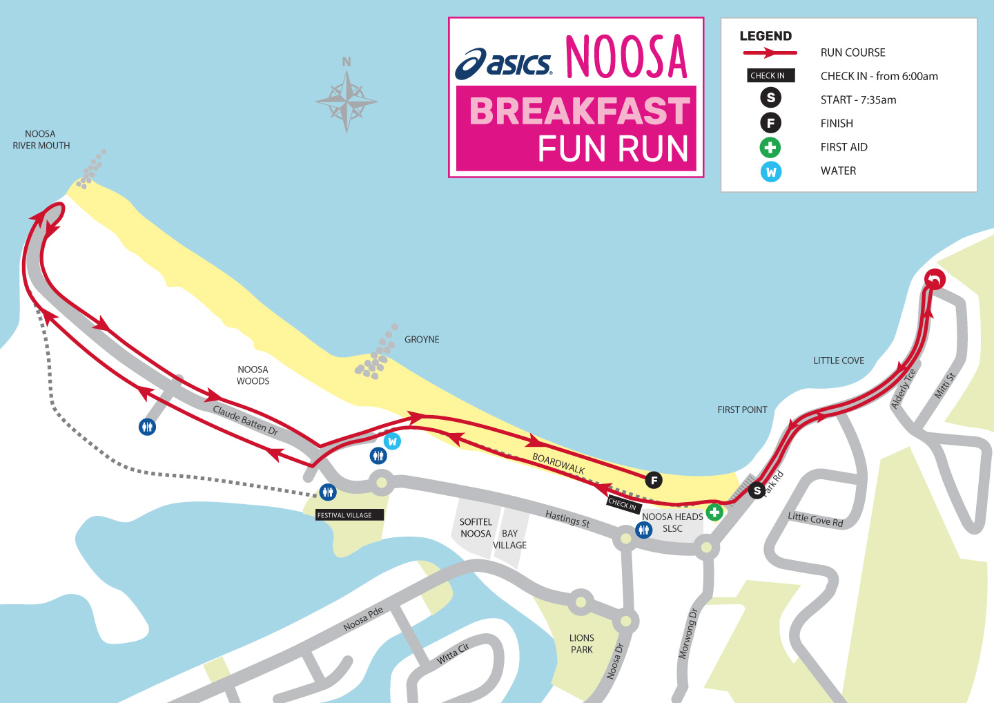 Starting on Park Road (east of Noosa Heads Surf Club), participants will run along Park Rd out to the National Park, before returning along the boardwalk to Noosa Main Beach. From here you will weave your way out to the river mouth before running along the beach back to where you started at the Surf Club. There is one Aid Station serving water at the halfway point as you pass the Groyne.