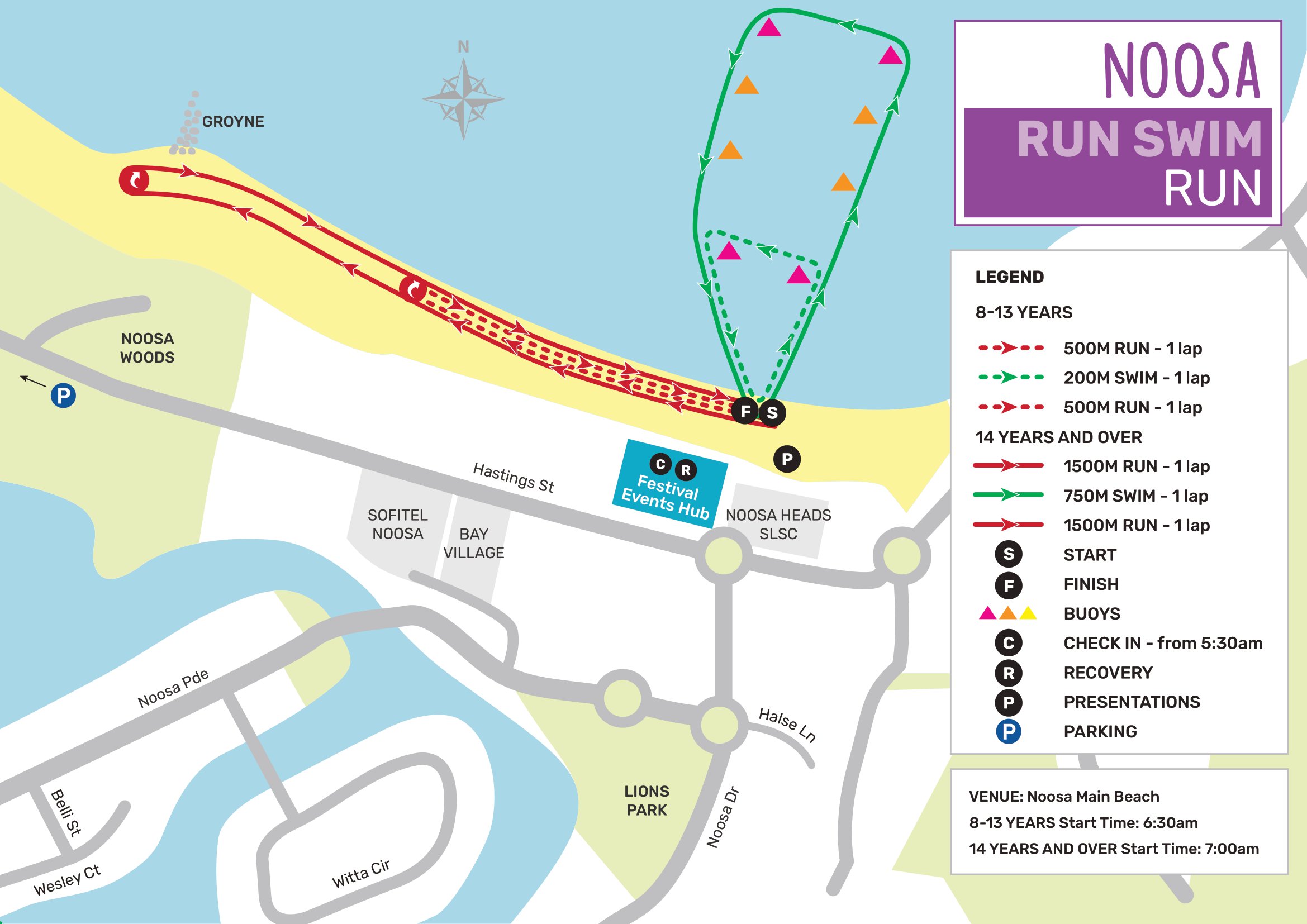 8-13 years: Run 500 meters along Noosa Main beach, a 200 meters swim in the bay, and final 500 meter dash to the finish line!